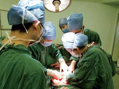 該患者3年前因腹腔腫物在當(dāng)?shù)乜h醫(yī)院行腫瘤切除術(shù),半年前復(fù)發(fā)且生長迅速。至來院就診時腫瘤巨大,上至肋弓,下達盆底,幾乎占據(jù)整個腹腔,腹部高度膨隆。曾去天津等地求診,均被拒之手術(shù),后來到我院腫瘤外一科,白希永主任帶領(lǐng)全科醫(yī)護人員對患者病情進行了認真的分析討論,認為患者腫瘤巨大,解剖層面不易顯露,且為復(fù)發(fā)性。上次手術(shù)后腹腔粘連,手術(shù)難度非常大,但通過核磁、CT等影像顯示,腫瘤雖血供豐富,但未侵及大血管和重要器官。巨瘤在腹內(nèi),病人非常痛苦,如不施治則嚴(yán)重威脅著患者的生命。經(jīng)過反復(fù)討論研究,最終決定攻堅克難為患者實施手術(shù)治療;并對手術(shù)入路、術(shù)中注意的事項和可能出現(xiàn)的問題均做了詳盡的分析和周密細致的術(shù)前準(zhǔn)備。