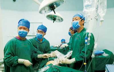 早在2010年,我院胸外科就開(kāi)展了胸腔鏡微創(chuàng)切除胸腺腫瘤。隨著病例數(shù)的增加,他們觀察到經(jīng)肋骨縫入路,病人術(shù)后胸痛往往比較嚴(yán)重。經(jīng)過(guò)幾年的改進(jìn),于2015年3月在華北地區(qū)首先開(kāi)展了胸腔鏡劍突下入路全胸腺清掃,只需要從劍突下打個(gè)2厘米的小孔就可以輕松完成手術(shù)了。也就是說(shuō),在我們老百姓說(shuō)的心口窩主心骨這個(gè)地方切一個(gè)小口,通過(guò)這個(gè)洞伸進(jìn)手術(shù)器械,可以完整地把整個(gè)胸腺拿出來(lái),甚至無(wú)需安放引流管,手術(shù)后幾個(gè)小時(shí)就可以下床,四五天就能出院回家了。2015年8月,河北省胸外科學(xué)術(shù)大會(huì)在承德召開(kāi),當(dāng)胸外科孔繁義主任向大會(huì)展示了他的手術(shù)錄像后,專家們震驚了,紛紛感慨這一手術(shù)方式的設(shè)計(jì)巧妙,也為操作者高超的手技藝術(shù)而贊嘆不絕。接下來(lái),在華北乃至國(guó)家級(jí)的學(xué)術(shù)會(huì)議上,孔主任多次介紹他的這一手術(shù)方式,同時(shí)他也被請(qǐng)去兄弟醫(yī)院傳經(jīng)送寶。