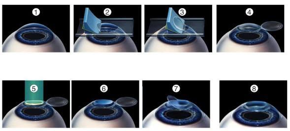 一、LASIK準(zhǔn)分子激光原位角膜磨鑲術(shù)。其方法是用角膜板層刀制作一個(gè)含少量基質(zhì)的角膜瓣,在瓣下用準(zhǔn)分子激光做角膜基質(zhì)切削。,適用于低中度及短期內(nèi)恢復(fù)視力的近視患者。如下圖:
