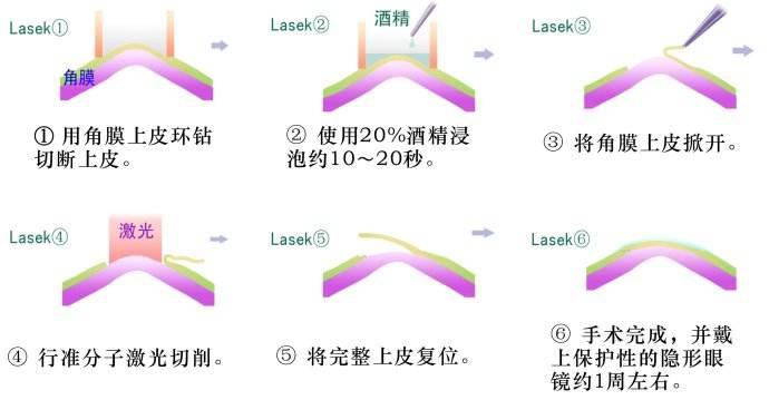 二、LASEK準(zhǔn)分子激光上皮下角膜磨鑲術(shù)簡(jiǎn)稱EK 。它是用特殊濃度的酒精松解角膜上皮,制作一個(gè)上皮瓣,在瓣下用準(zhǔn)分子激光切削上皮層的前彈力層和淺層基質(zhì)。適用于角膜薄、曲率大、角膜斑翳的低度數(shù)近視患者。如下圖: