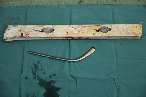 16點25分,張女士被送至手術(shù)室。麻醉一科醫(yī)護團隊在牛志強主任帶領(lǐng)下迅速為傷者建立了液體通路并在傷者被動體位下克服困難進行氣管插管,以最快的速度完成了整個麻醉過程,為手術(shù)迅速進行爭取了寶貴的時間。在心胸外科首席專家周繼梧的指導(dǎo)下,心胸外科主任張楠打開傷者的左側(cè)胸腔,仔細探查貫通左胸膛的金屬護欄對組織器官造成的損傷情況:近半米長、10厘米寬的金屬護欄從左上胸壁刺入胸腔,斜向外下方貫通身體后從左側(cè)肩胛骨刺出,造成了多發(fā)肋骨骨折、開放性血氣胸、肺部挫裂傷和左側(cè)肩胛骨骨折,幸運的是,護欄剛好避開了傷者心臟和大血管。