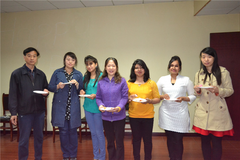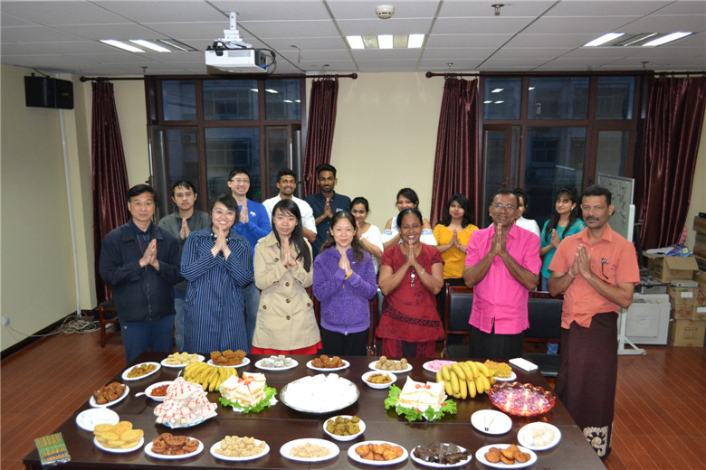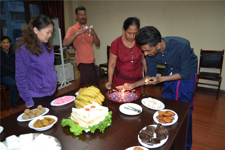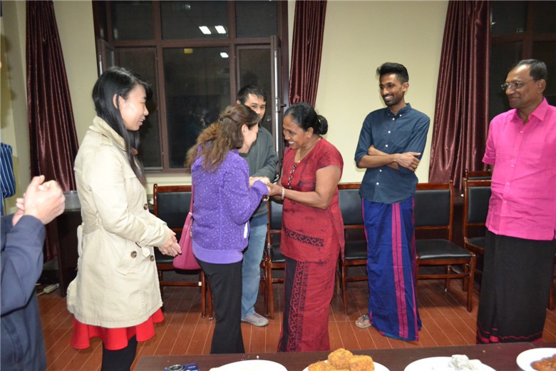 留學(xué)生看見彭處長(zhǎng)一行就像見到親人一樣,用他們的話說,他們?cè)缇桶褱嬷莓?dāng)成第二故鄉(xiāng)。他們身著自己國(guó)家的傳統(tǒng)服裝,按照家鄉(xiāng)的風(fēng)俗準(zhǔn)備了一桌豐盛的美食來款待與他們共度新年的老師及其他同學(xué)。斯里蘭卡留學(xué)生熱情的為大家講解了當(dāng)?shù)剡^年的風(fēng)俗。