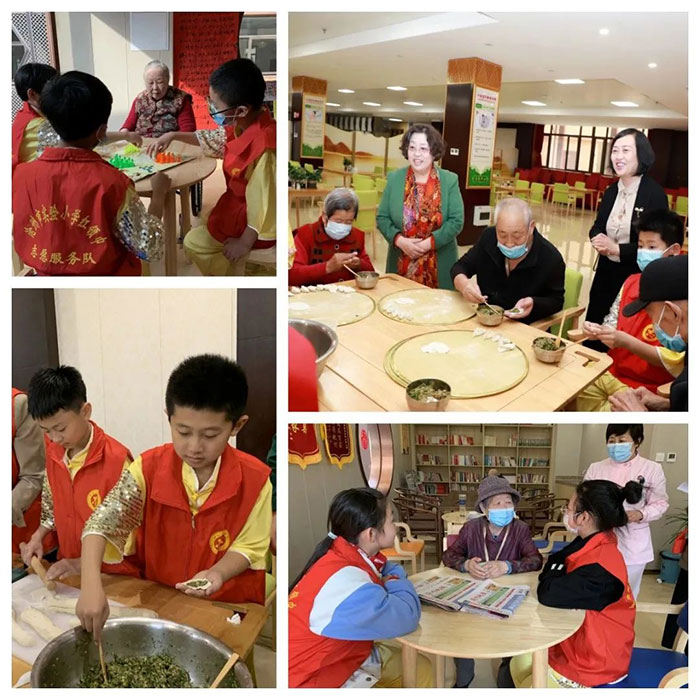孩子們陪老人們聊天、讀書、下棋、包餃子,一老一小,其樂融融,豐富多彩的活動,給老人們帶來歡快喜悅的心情。最后孩子們?yōu)槔先藗兣宕骷t領(lǐng)巾,并送上親手制作的賀卡,共同合影留念,記錄下這美好時刻。
