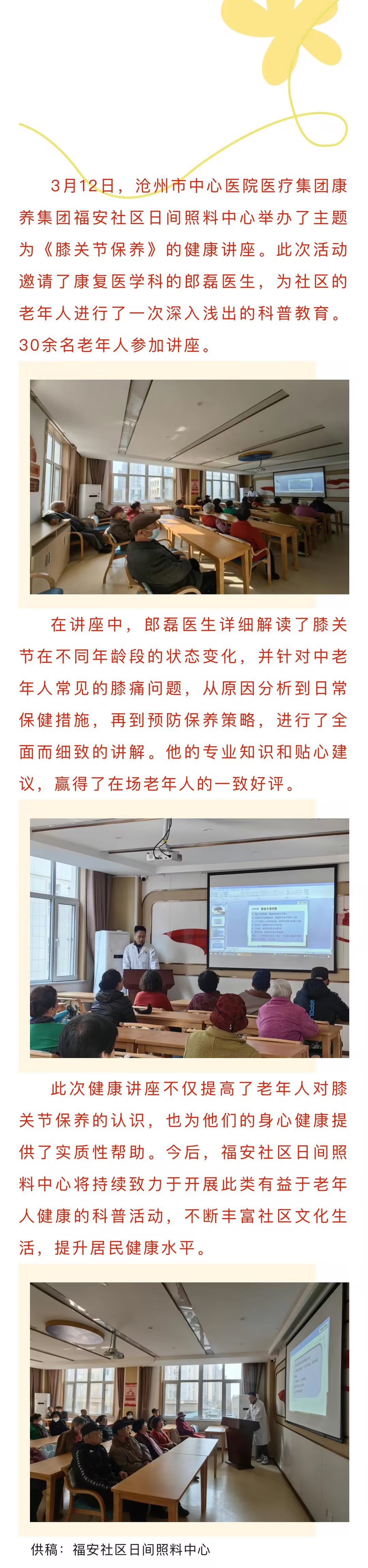 滄州市中心醫(yī)院醫(yī)療集團(tuán)康養(yǎng)集團(tuán)福安社區(qū)日間照料中心舉辦《膝關(guān)節(jié)保養(yǎng)》健康講座 第91期