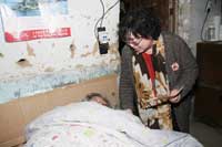 隨后溫院長(zhǎng)又來到79歲的魯志蘭老人家。她身患糖尿病、高血壓,中風(fēng)后伴有小腦萎縮,沒有經(jīng)濟(jì)來源;兒子患有腦中風(fēng),兩個(gè)孫子的生活也很困難。將慰問品和慰問金送到老人手中,老人緊緊握住溫院長(zhǎng)的手,嘴角顫動(dòng)著一句話也說不出來,眼中卻早已流出激動(dòng)的淚水。