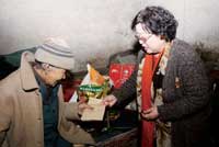 家住杜林的提秀蘭老人今年已經(jīng)91歲,身體還算硬朗,有些頭暈眼花、不時(shí)出現(xiàn)關(guān)節(jié)痛。這是一個(gè)應(yīng)該安享晚年的年齡,但是老人仍然獨(dú)自照顧著59歲的智障兒子周來章。溫院長(zhǎng)一直關(guān)注著生活困難的娘倆,常年對(duì)他們進(jìn)行幫扶。每逢佳節(jié)來臨,溫院長(zhǎng)更是對(duì)老人多一份牽掛,總會(huì)帶著慰問金和慰問品來看望她。進(jìn)門后,溫院長(zhǎng)的第一句話就是“大娘過年好,我來看看你,給你拜年!”看到是溫院長(zhǎng)來了,老人高興得說不出話,只是拉著溫院長(zhǎng)的手不停地往屋里讓。溫院長(zhǎng)親切地和提秀蘭拉起家常,仔細(xì)詢問了老人的身體情況和日常起居,叮囑老人保重身體,并送上1000元慰問金和米、面、油、雞蛋等慰問品。臨行,老人久久佇立在門前,目送溫院長(zhǎng)一行離開。