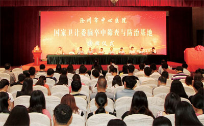6月11日,“國家衛(wèi)計委腦卒中篩查與防治基地”揭牌暨“滄州市腦卒中篩查與防治網(wǎng)絡(luò)”啟動儀式在滄州市金獅國際酒店隆重舉行。中國工程院院士、全國人大常委會委員、國家衛(wèi)計委腦卒中篩查與防治工程委員會副主任王隴德,國家衛(wèi)計委辦公廳秘書處處長巢寶華,河北省衛(wèi)計委巡視員趙瑜,滄州市人大主任匡洪治,滄州市人民政府副市長吳燕等專程出席。美國南卡羅來那州大學(xué)神經(jīng)介入培訓(xùn)部主任喬德利,天津環(huán)湖醫(yī)院院長、神經(jīng)外科學(xué)教授王金環(huán),天津環(huán)湖醫(yī)院神經(jīng)內(nèi)科主任張佩蘭應(yīng)邀出席揭牌儀式。我院全體院領(lǐng)導(dǎo),各科室負(fù)責(zé)人,縣醫(yī)院及鄉(xiāng)鎮(zhèn)衛(wèi)生院代表參加了啟動儀式。儀式由市衛(wèi)生局副局長胡朝陽主持。
