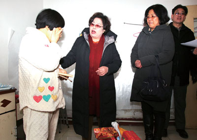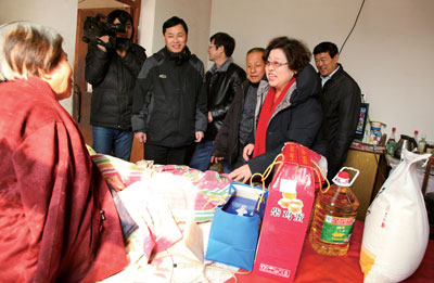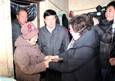慰問了市區(qū)的貧困家庭之后,溫院長(zhǎng)一行驅(qū)車趕到滄縣杜林,走進(jìn)周來張家的大門。周來張,現(xiàn)年60歲,因智障喪失勞動(dòng)能力,一直由母親提秀蘭老人照料生活。如今,周來張的母親已經(jīng)年逾九旬,身子骨依然硬朗。溫院長(zhǎng)一進(jìn)門,老人家便熱情迎上前去,拉著溫院長(zhǎng)的手不放,把溫院長(zhǎng)領(lǐng)進(jìn)屋中,拉起了家常。盡管是上午,屋里依然昏暗,散發(fā)著刺鼻的霉味。溫院長(zhǎng)把1000元慰問金和米面雞蛋等慰問品交給提秀蘭,詳細(xì)詢問了母子二人的身體情況,生活中存在的困難,叮囑他們一定要保重身體,明年再來探望。