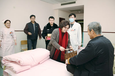 呂某,本該與愛人和孩子繼續(xù)著健康幸福的生活,卻因腎功能不全患上系統(tǒng)性紅斑狼瘡,逐漸失去了勞動(dòng)能力,現(xiàn)在正在我院腎內(nèi)二科接受治療,生活十分困難。為了就近治療,她不得不將年幼的孩子留在鹽山老家,到市面粉廠宿舍租房居住?,F(xiàn)在她的愛人在外打工,補(bǔ)貼家用。溫院長(zhǎng)看在眼里,疼在心上,在代表醫(yī)院送給呂某慰問金和米面油等慰問品后,又以個(gè)人名義拿出500元錢交到呂某手上,鼓勵(lì)呂某鼓起勇氣,積極面對(duì)生活。呂某向溫院長(zhǎng)和腎內(nèi)二科的醫(yī)護(hù)人員表示了衷心的感謝,并答應(yīng)一定不辜負(fù)溫院長(zhǎng)的囑托,全力配合治療。