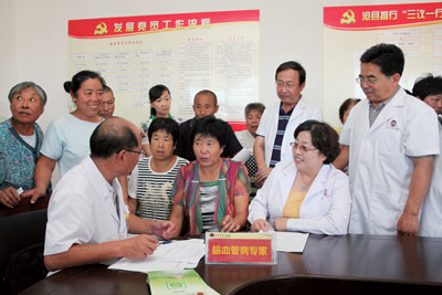 義診現(xiàn)場,聞訊而來的群眾摩肩接踵,每位醫(yī)師的面前都排起了長龍。今年72歲的劉老伯被兒子攙扶著走進(jìn)診室,劉老伯說,自己這么大歲數(shù)了從來沒有體檢過,聽說中心醫(yī)院的專家們今天來義診了還免費(fèi)體檢,一大早就往村委會趕?!爸行尼t(yī)院可真好啊,把大夫送到了俺們家門口,真是太方便了,俺今天要讓大夫給開點(diǎn)降壓藥,還要做個彩超……”