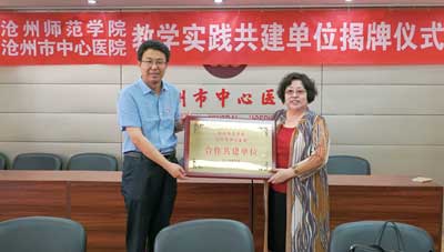 最后在熱烈的掌聲中,我院院長溫秀玲與滄州師范學(xué)院校長云電軍共同為教學(xué)實踐合作共建單位揭牌。接著,云校長向我院急診部、內(nèi)分泌糖尿病四科進行“應(yīng)用心理學(xué)教學(xué)實踐基地”授牌。