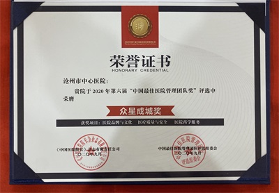會(huì)上,滄州市中心醫(yī)院從全國(guó)400余家參評(píng)醫(yī)院中順利入圍,憑借“醫(yī)院品牌與文化”“醫(yī)療質(zhì)量與安全”“醫(yī)院藥學(xué)服務(wù)”三大五星級(jí)管理項(xiàng)目榮獲“2020年度第六屆中國(guó)最佳醫(yī)院管理團(tuán)隊(duì)獎(jiǎng)·眾心成城獎(jiǎng)”。
