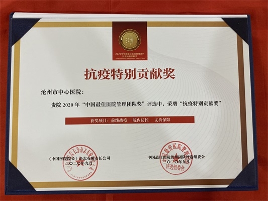 為發(fā)掘、表彰抗疫中表現(xiàn)突出的醫(yī)院管理團(tuán)隊(duì),彰顯中國(guó)醫(yī)院管理在特殊時(shí)期風(fēng)采,本屆“中國(guó)最佳醫(yī)院管理團(tuán)隊(duì)”特別增設(shè)“抗疫特別貢獻(xiàn)獎(jiǎng)”評(píng)選表彰疫情防控中的中國(guó)最佳醫(yī)院管理團(tuán)隊(duì)。滄州市中心醫(yī)院憑借在疫情防控工作中的突出表現(xiàn),榮獲“2020年度中國(guó)最佳醫(yī)院管理團(tuán)隊(duì)獎(jiǎng)”——“前線戰(zhàn)役”“院內(nèi)防控”“支持保障”三大項(xiàng)目的“抗疫特別貢獻(xiàn)獎(jiǎng)”!
