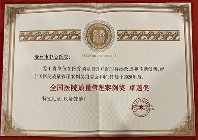 在《中國(guó)醫(yī)院院長(zhǎng)》雜志特發(fā)起、6家醫(yī)院管理研究院(所)擔(dān)任顧問(wèn)機(jī)構(gòu)、19名專家擔(dān)任評(píng)審委員會(huì)成員的“中國(guó)醫(yī)院質(zhì)量管理獎(jiǎng)”評(píng)選活動(dòng)中,滄州市中心醫(yī)院經(jīng)過(guò)近7個(gè)月的申報(bào)參評(píng)、實(shí)地調(diào)研、網(wǎng)上初選、專家復(fù)審及入圍公示,憑借多年的先進(jìn)質(zhì)管理念與創(chuàng)新實(shí)踐經(jīng)驗(yàn),以及在醫(yī)院促進(jìn)質(zhì)量提升工作中取得的突出成績(jī),在評(píng)選中脫穎而出,榮獲“2020年第三屆全國(guó)醫(yī)院質(zhì)量管理案例獎(jiǎng)”,以標(biāo)桿的力量引導(dǎo)、激勵(lì)各級(jí)醫(yī)院建立和實(shí)施卓越質(zhì)量管理模式,提高醫(yī)院服務(wù)能力與水平,增加醫(yī)院綜合競(jìng)爭(zhēng)力。