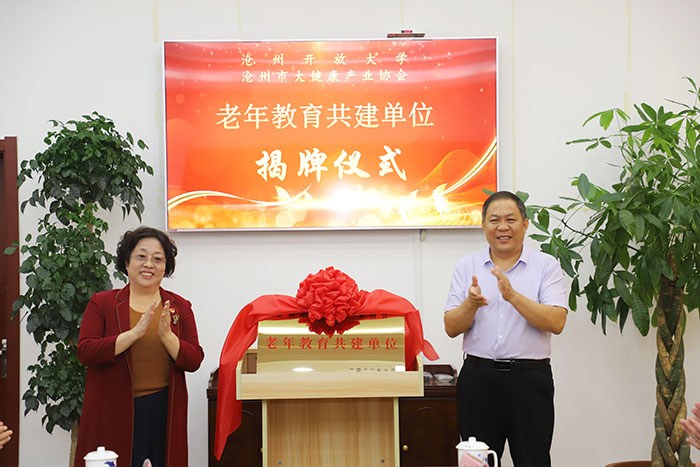 9月28日,滄州市大健康產(chǎn)業(yè)協(xié)會(huì)和滄州開放大學(xué)老年教育共建單位揭牌儀式在滄州開放大學(xué)舉行。滄州市大健康產(chǎn)業(yè)協(xié)會(huì)會(huì)長、院黨委書記溫秀玲,滄州開放大學(xué)黨委書記熊俊杰共同為“老年教育共建單位”揭牌,同時(shí)為滄州開放大學(xué)授予“滄州市大健康產(chǎn)業(yè)協(xié)會(huì)副會(huì)長單位”銅牌。滄州市大健康產(chǎn)業(yè)協(xié)會(huì)、滄州市開放大學(xué)、我院相關(guān)領(lǐng)導(dǎo)和負(fù)責(zé)人與會(huì)。
