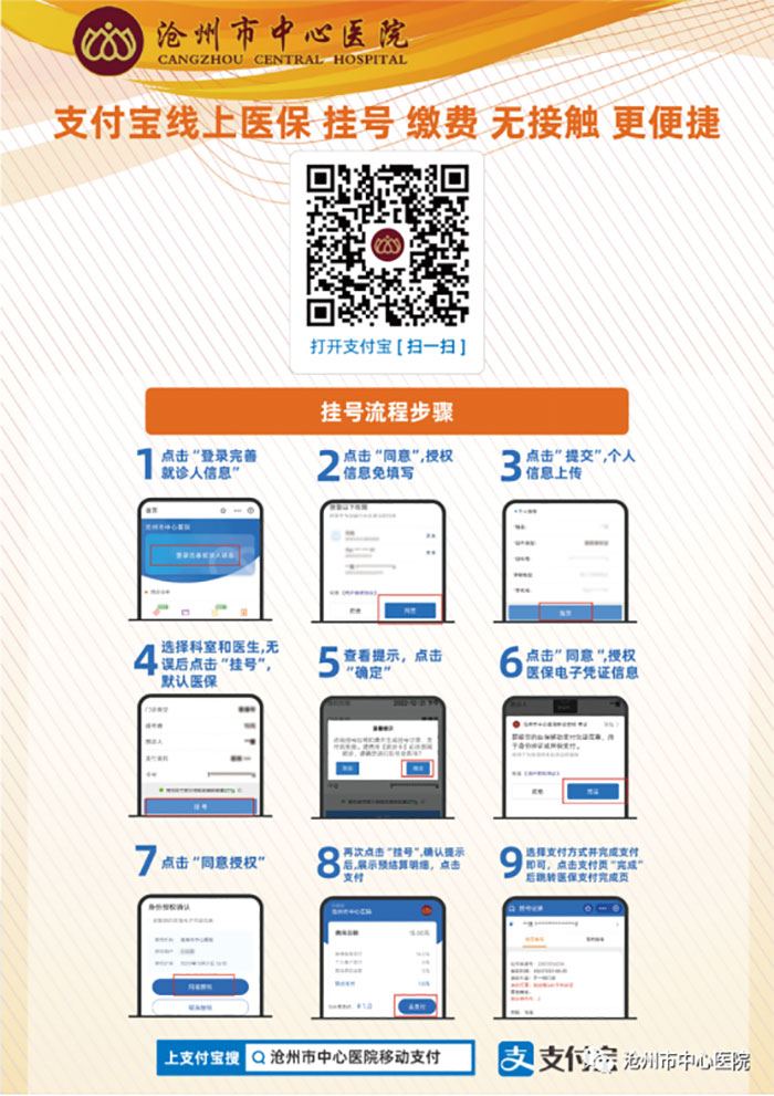 好消息!滄州市中心醫(yī)院公眾號現(xiàn)已支持線上醫(yī)保掛號,通過公眾號跳轉(zhuǎn)支付寶小程序的方式,實現(xiàn)電子憑證脫卡結(jié)算,報銷掛號費,無需排隊等候,讓患者少跑路。
