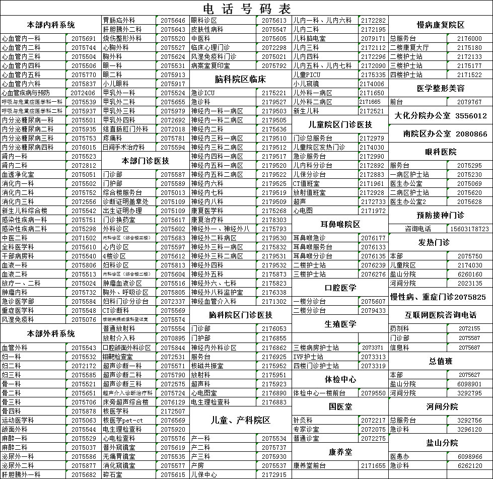 (溫馨提示:急診、發(fā)熱門診、總值班、臨床科室24小時值班,其他區(qū)域正常上班時間可以接待電話咨詢。)