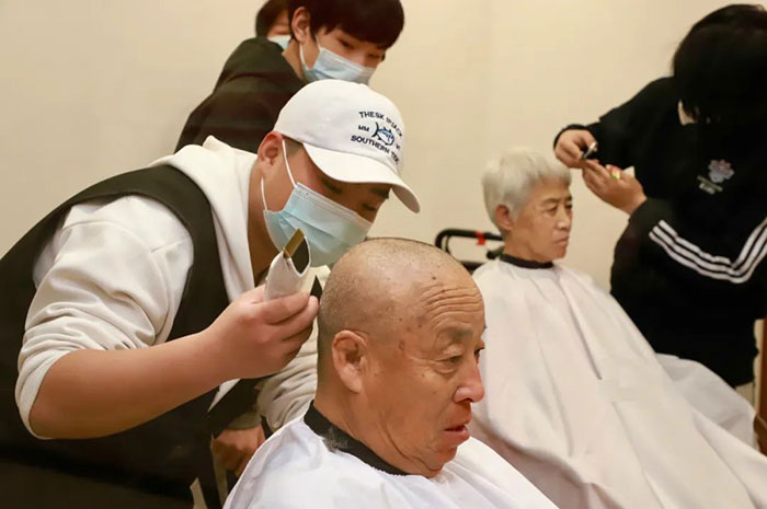 百善孝為先,“尊老、敬老、愛老”是中華民族的傳統(tǒng)美德,老年人是全社會(huì)寶貴財(cái)富,關(guān)愛今天的老人就是關(guān)愛明天的自己?;顒?dòng)中,外請(qǐng)來的美發(fā)老師根據(jù)老人們的要求,精心修剪著頭發(fā)。黨員志愿者們有的幫助打掃剪落的碎頭發(fā),有的熱情地陪老人們聊天,整個(gè)活動(dòng)現(xiàn)場(chǎng)洋溢著歡聲笑語??粗藜糁笄逅陌l(fā)型,老人們笑得合不攏嘴,開心的像個(gè)孩子一樣與志愿者合影留念。