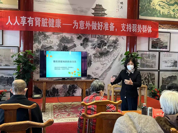 課程開始,孫主任首先向前來聽講的居民簡單介紹了腎臟的生理作用,即:生成尿液、內(nèi)分泌功能、維持機體水、電解質(zhì)和酸堿平衡。孫主任講到,人體的腎臟一旦患病,這些功能就會產(chǎn)生障礙,據(jù)統(tǒng)計,全世界每9個成年人中就有1例慢性腎臟病,而當(dāng)前我國慢性腎臟病具有患病率高、知曉率低、致殘率高等特點,所以盡量做到對高危人群要早篩查,出現(xiàn)癥狀時要早診斷、早治療就顯得尤為重要。