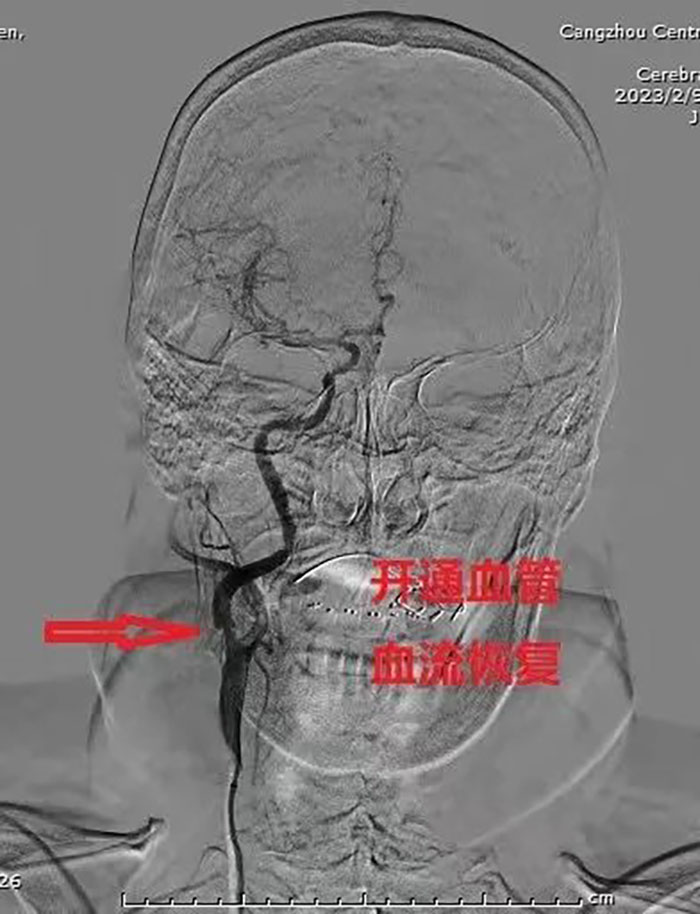半小時后,患者進(jìn)入手術(shù)室,術(shù)中發(fā)現(xiàn)患者右側(cè)頸內(nèi)動脈起始部閉塞,導(dǎo)管越過起始部,造影發(fā)現(xiàn)頸內(nèi)動脈遠(yuǎn)端栓塞,使用顱內(nèi)抽吸導(dǎo)管一次性抽出堵塞的血栓,開通頸內(nèi)動脈,使遠(yuǎn)端大腦中動脈和大腦前動脈血流快速恢復(fù)。最后對頸內(nèi)動脈起始部進(jìn)行了球囊擴(kuò)張,使頸內(nèi)動脈起始部狹窄程度維持在中度狹窄,目前患者愈后效果良好。