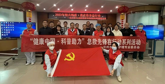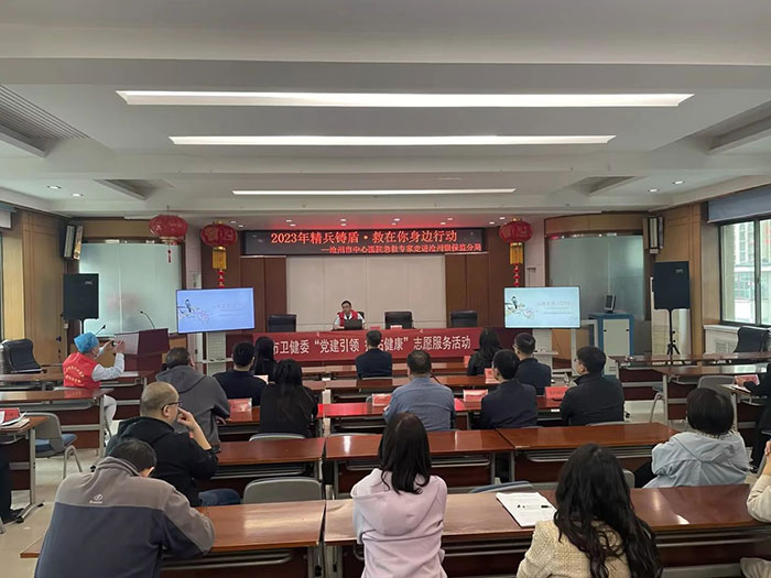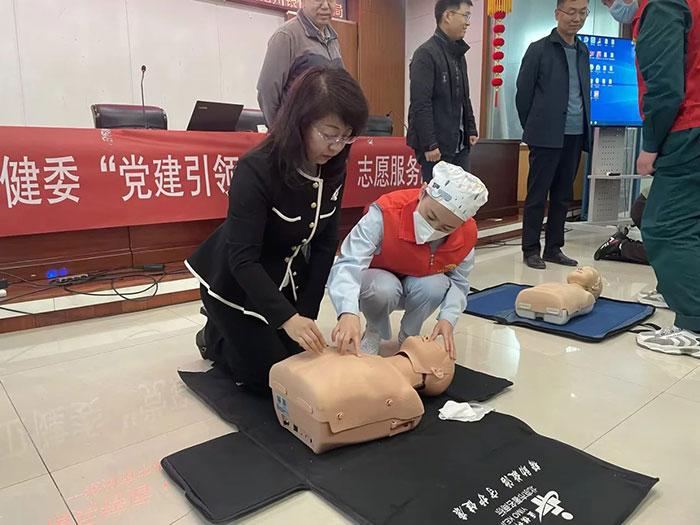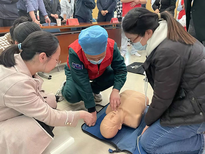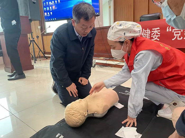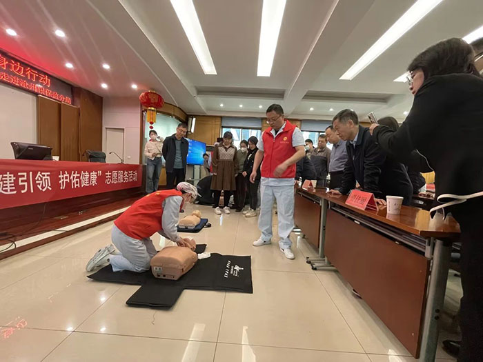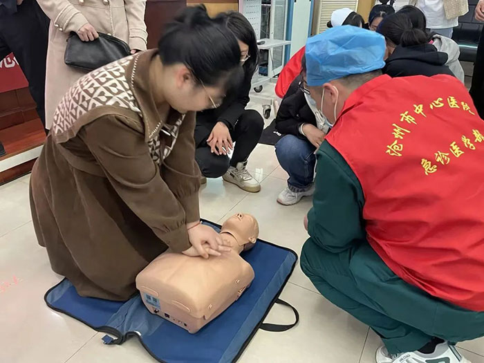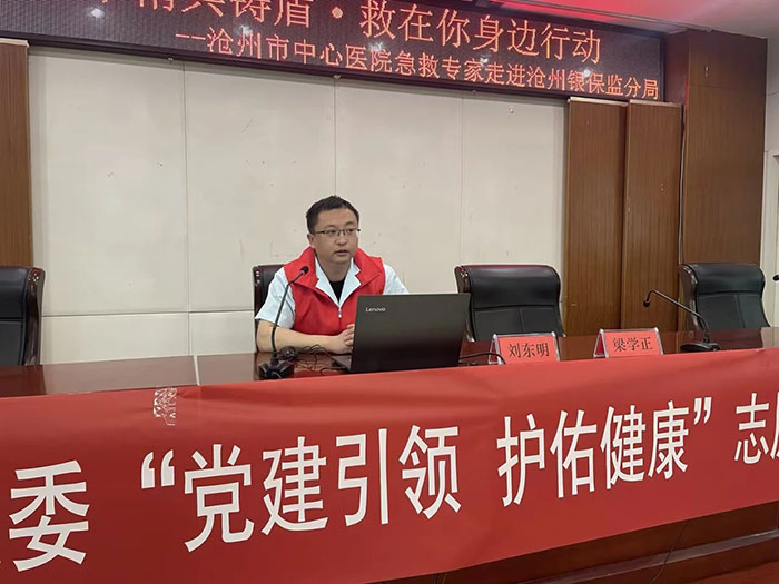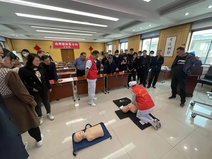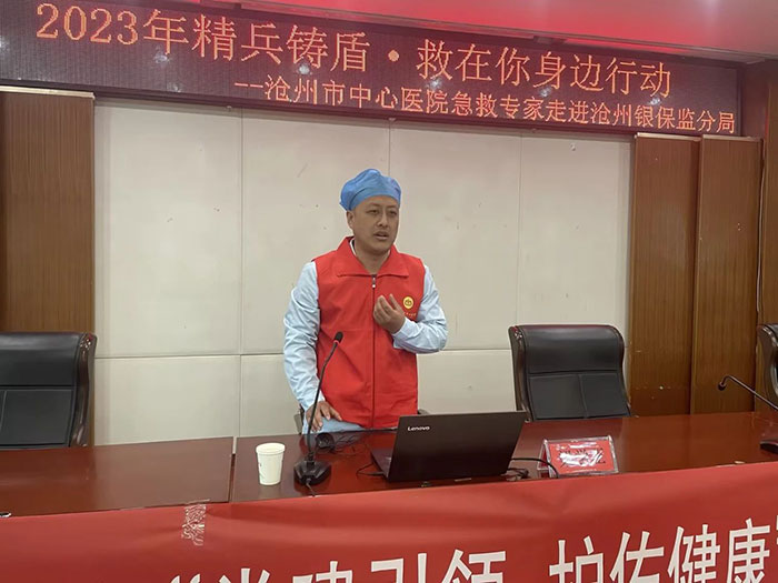 4月11日,滄州市中心醫(yī)院急診醫(yī)學(xué)部副主任劉東明、副護(hù)士長梁學(xué)正及4位急救醫(yī)護(hù)人員來到滄州銀保監(jiān)分局針對心肺復(fù)蘇和海姆立克急救法進(jìn)行了理論講解和現(xiàn)場演示。