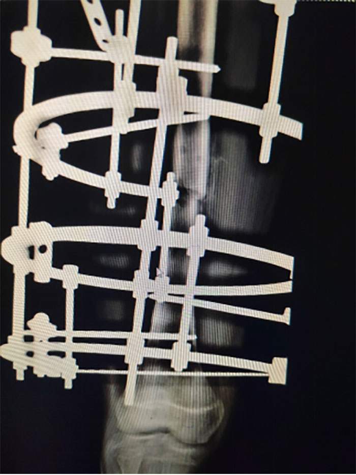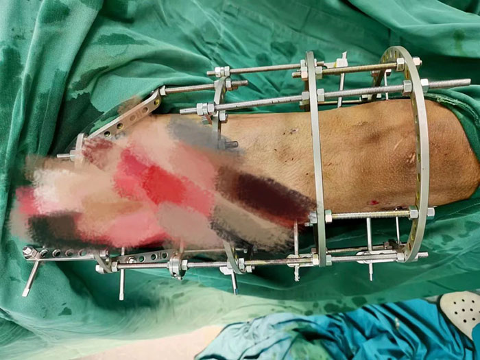 對(duì)于患者來說,時(shí)間就是生命。為了在治療燙傷的同時(shí)不耽誤患者下肢骨折的治療,經(jīng)過多學(xué)科會(huì)診討論后,金馳主任決定采用基于Ilizarov技術(shù)的洞孔環(huán)式外固定架進(jìn)行股骨骨折的復(fù)位和外固定術(shù),使患者燙傷和骨折同時(shí)進(jìn)行恢復(fù),以便于早期拄拐下床活動(dòng),降低患者的痛苦和臥床時(shí)間。