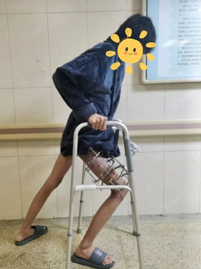術(shù)后第二天患者即可帶架拄拐下床活動(dòng),大大減輕了患者需長期臥床所帶來的痛苦;同時(shí),創(chuàng)傷骨一科(骨七科)醫(yī)護(hù)團(tuán)隊(duì)以加速患者康復(fù)為目的,協(xié)助肢體功能康復(fù)鍛煉,同時(shí)進(jìn)行心理疏導(dǎo)治療。從協(xié)助慢慢活動(dòng),到自主翻身活動(dòng)坐立,醫(yī)護(hù)人員貼心的護(hù)理和溫暖的鼓勵(lì)讓小慶樹立起了康復(fù)的信心,小慶身體狀況的日漸好轉(zhuǎn),臉上也恢復(fù)了往日的笑容。