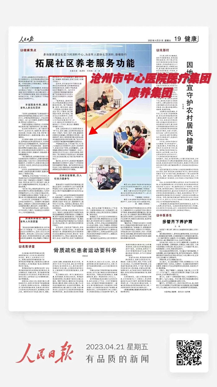 人民日報是中國第一大報,始終聚焦民生,為民發(fā)聲。 4月21日,人民日報社第27313期19版就滄州市中心醫(yī)院醫(yī)療集團康養(yǎng)集團醫(yī)養(yǎng)結合養(yǎng)老服務工作取得的顯著成效進行了刊登報道,并給予高度評價和肯定。 |