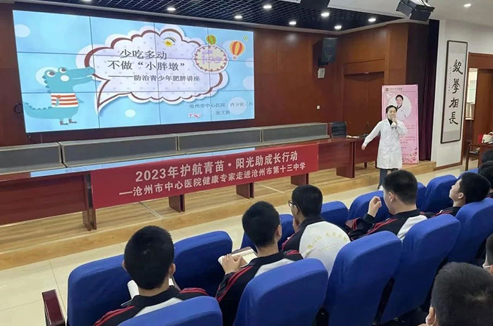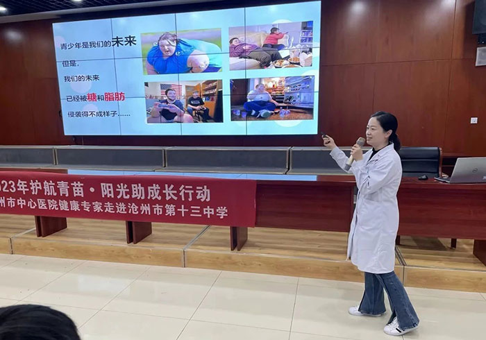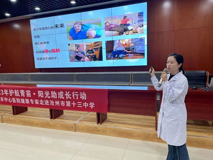 4月23日,滄州市中心醫(yī)院內(nèi)分泌糖尿病三科醫(yī)師張文靜來到滄州市第十三中學,為七年級和八年級兩個班150多名學生進行了主題為《少吃多動 不做小胖墩》的肥胖防治健康講座。