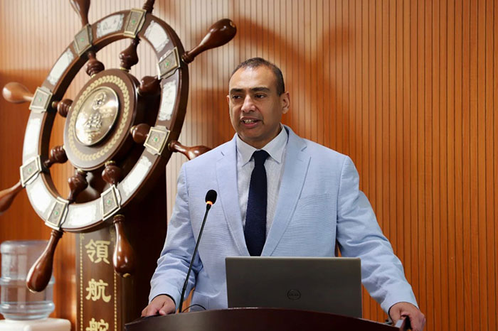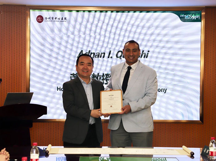 黨委副書記、院長(zhǎng)李勇為安南(Adnan I.Qureshi)教授頒發(fā)客座教授聘書