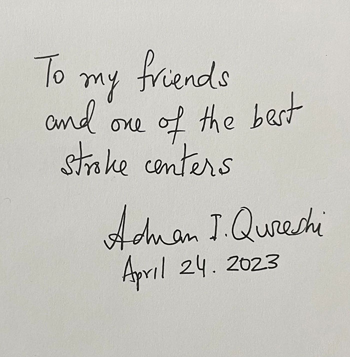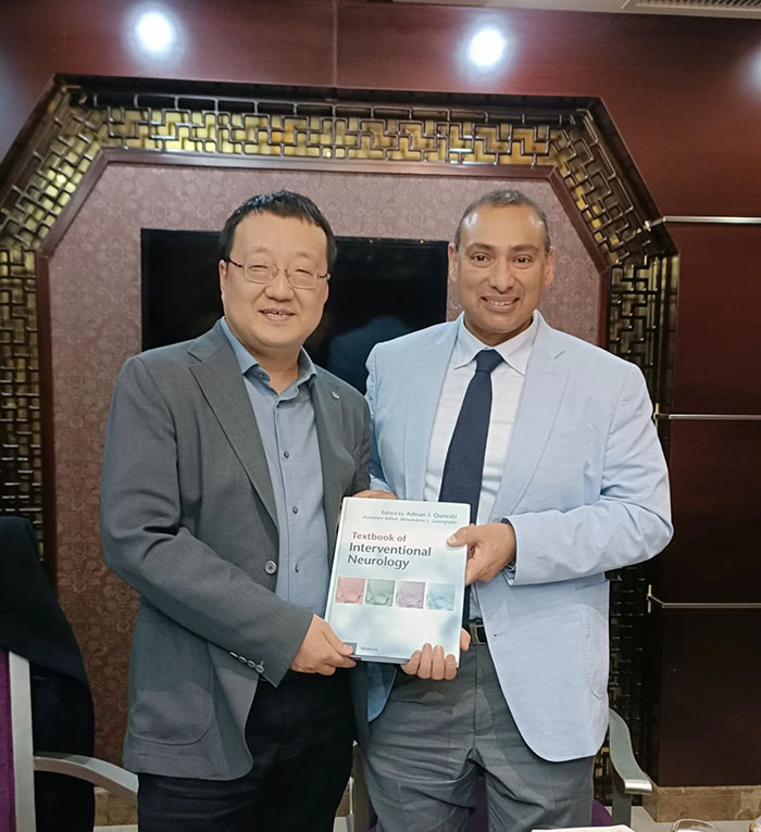 安南教授了解到滄州市中心醫(yī)院靜脈溶栓DNT中位數(shù)時間為25分鐘時倍感震驚,對醫(yī)院融合型卒中中心模式及高效治療水平給予高度的評價,隨即將自己編寫的《Textbook of Interventional Neurology》神經(jīng)血管介入教科書簽名后贈予劉永昌主任,同時寫下了“To my friends and one of the best stroke centers(致我的朋友和最好的卒中中心之一)"的贈言。