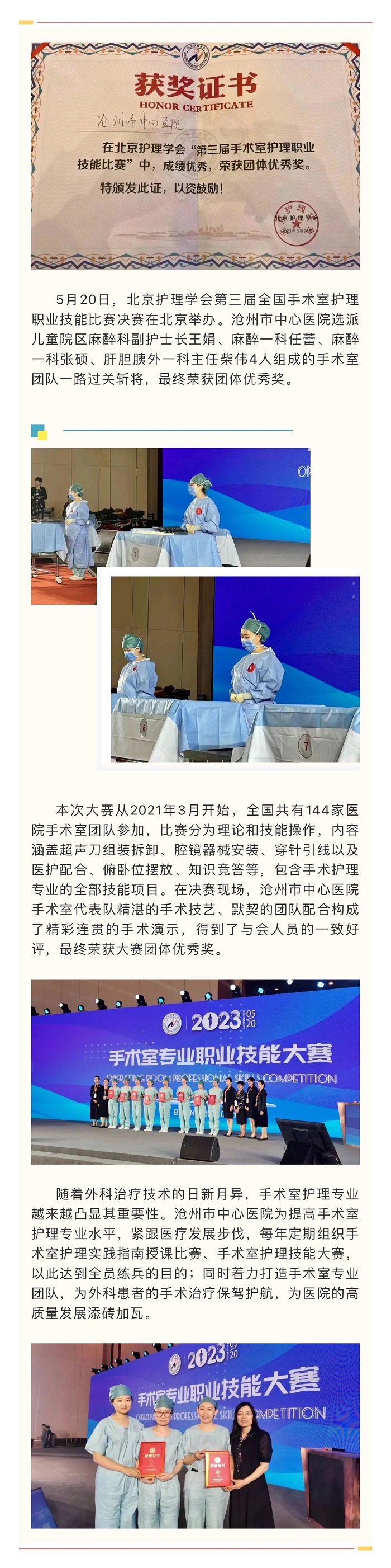 喜報(bào)!滄州市中心醫(yī)院榮獲全國(guó)手術(shù)室護(hù)理職業(yè)技能比賽團(tuán)體優(yōu)秀獎(jiǎng)