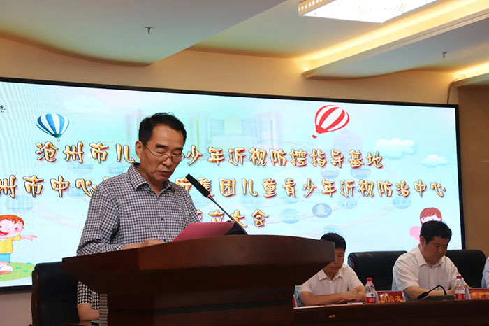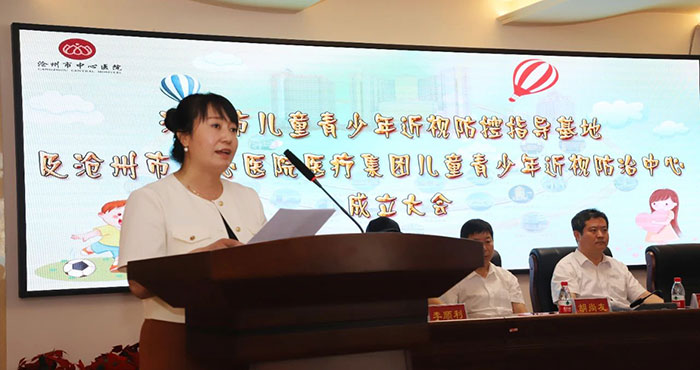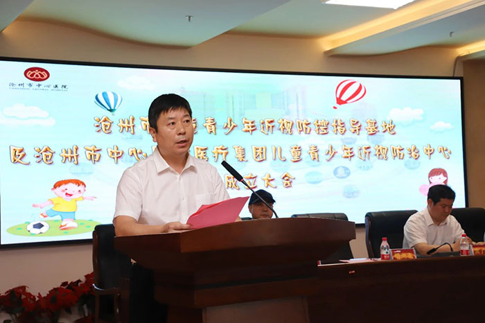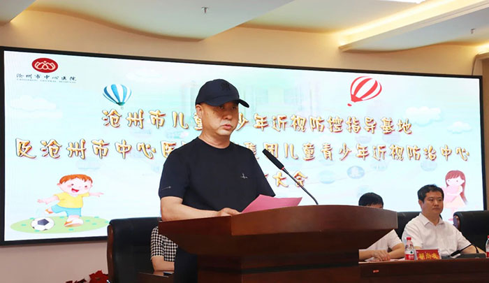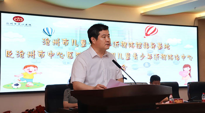 滄州市中心醫(yī)院黨委書記高廣明致辭,表示醫(yī)院作為滄州市兒童青少年近視防控指導(dǎo)基地、滄州市中心醫(yī)院醫(yī)療集團(tuán)兒童青少年近視防控中心和滄州市兒童青少年近視防控聯(lián)盟牽頭單位,將充分發(fā)揮專業(yè)技術(shù)優(yōu)勢,不斷在基礎(chǔ)設(shè)施、醫(yī)療設(shè)備、人才培養(yǎng)等方面加大投入,依托健康副校(園)長的工作平臺,更好地承擔(dān)全市兒童青少年近視綜合防控醫(yī)療技術(shù)指導(dǎo)、業(yè)務(wù)培訓(xùn)等工作,深入全市廣大城鄉(xiāng)的學(xué)校、社區(qū)、鄉(xiāng)村,開展義診、科普講座、健康體檢等活動,將這一個功在當(dāng)代、利在千秋的工作落到實(shí)處。