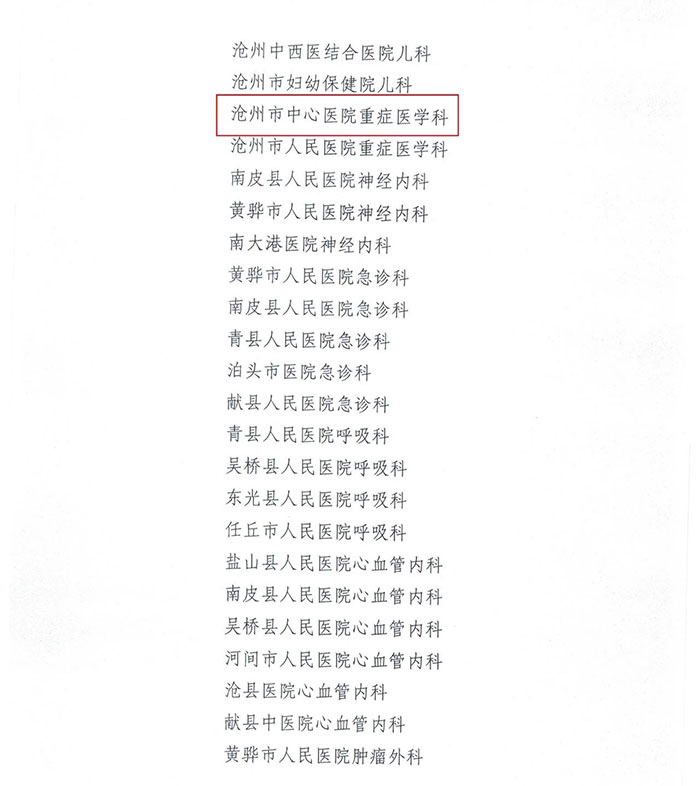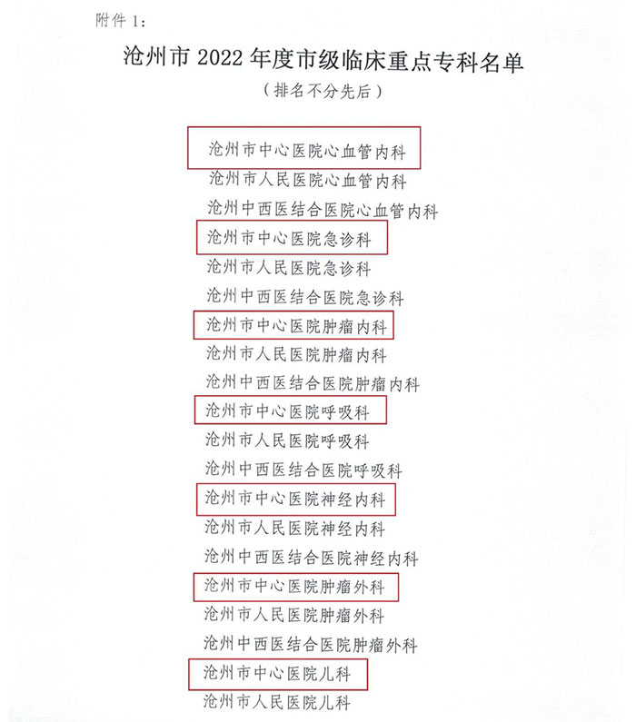 根據(jù)《河北省“十四五”臨床??颇芰ㄔO(shè)方案》(冀衛(wèi)發(fā)〔2023〕3號(hào))等文件要求和工作安排,滄州市衛(wèi)生健康委員會(huì)開展了2022年度市級臨床重點(diǎn)??棋噙x工作,經(jīng)過綜合評定,滄州市中心醫(yī)院心血管內(nèi)科、急診科、腫瘤內(nèi)科、呼吸科、神經(jīng)內(nèi)科、腫瘤外科、兒科、重癥醫(yī)學(xué)科8個(gè)???5個(gè)科室被確定為2022年度市級臨床重點(diǎn)專科。
