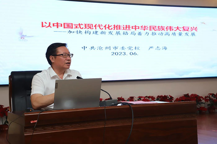 隨后召開的中共滄州市中心醫(yī)院委員會2023年黨務干部集中培訓大會上,滄州市委黨校二級調研員、滄州市黨的建設研究會副會長嚴志海講授慶祝中國共產(chǎn)黨成立102周年系列活動專題黨課,以《以中國式現(xiàn)代化推進中華民族偉大復興——加快構建新發(fā)展格局 著力推動高質量發(fā)展》為題,將黨的理論知識與醫(yī)院發(fā)展實際相結合進行精彩講解。