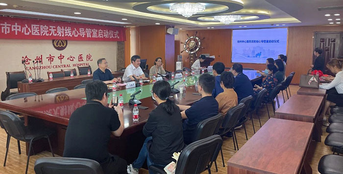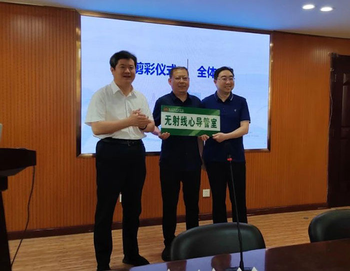 河北醫(yī)科大學(xué)第二醫(yī)院張冀東教授、滄州市中心醫(yī)院黨委書記高廣明一同為無射線心導(dǎo)管室剪彩