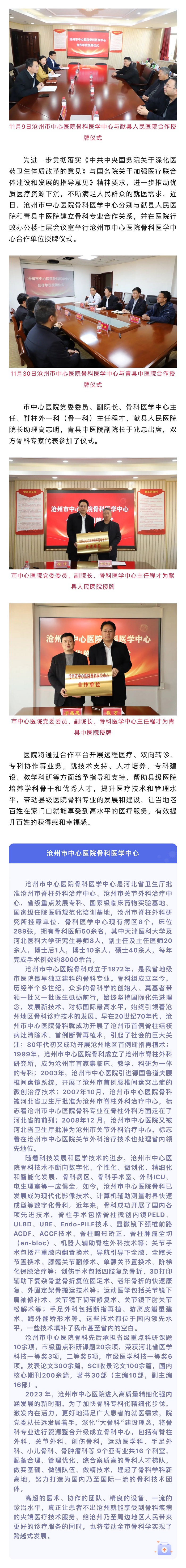發(fā)揮骨科醫(yī)學(xué)中心優(yōu)勢(shì) 推動(dòng)優(yōu)質(zhì)醫(yī)療資源下沉|滄州市中心醫(yī)院與獻(xiàn)縣人民醫(yī)院、青縣中醫(yī)院建立骨科專業(yè)合作關(guān)系