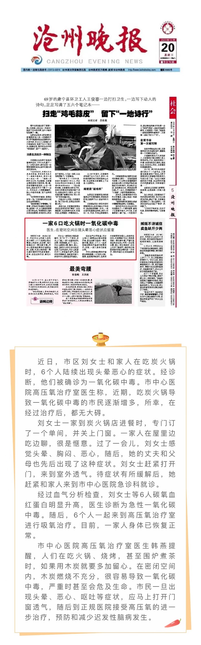 滄州晚報(bào)刊發(fā) | 一家6口吃火鍋時(shí)一氧化碳中毒 醫(yī)生:在密閉空間出現(xiàn)頭暈惡心癥狀應(yīng)留意