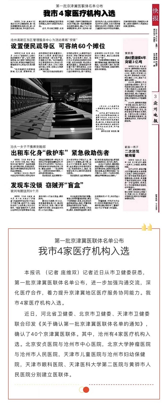 滄州晚報(bào)刊發(fā):第一批京津冀醫(yī)聯(lián)體名單公布 滄州市中心醫(yī)院入選