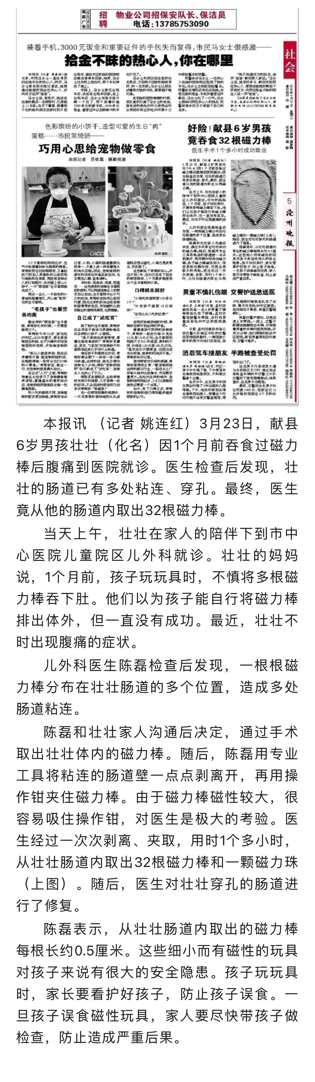 滄州晚報(bào):好險(xiǎn)!獻(xiàn)縣6歲男孩竟吞食32根磁力棒 醫(yī)生手術(shù)1個(gè)多小時(shí)成功取出