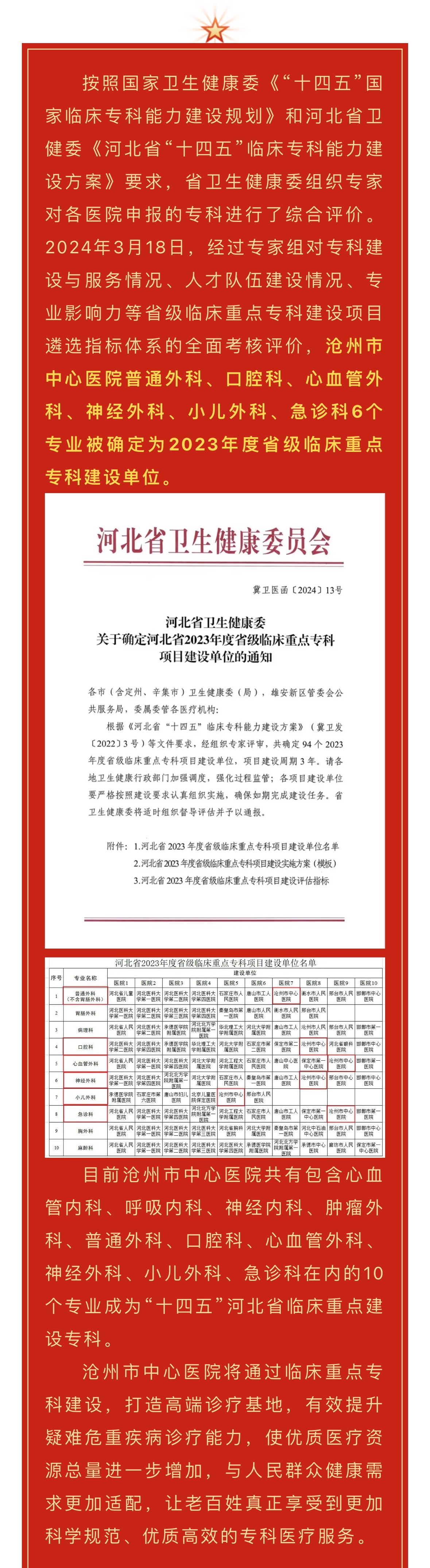 專科建設再傳喜訊|滄州市中心醫(yī)院普通外科、口腔科、心血管外科、神經(jīng)外科、小兒外科、急診科成為“十四五”河北省臨床重點建設專科
