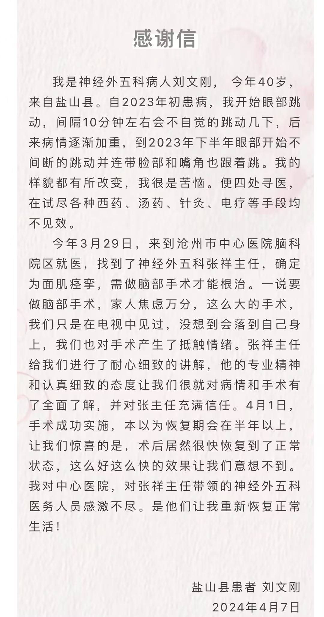 【紙短情長(zhǎng)】感謝滄州市中心醫(yī)院神經(jīng)外五科醫(yī)務(wù)人員讓我重新恢復(fù)正常生活