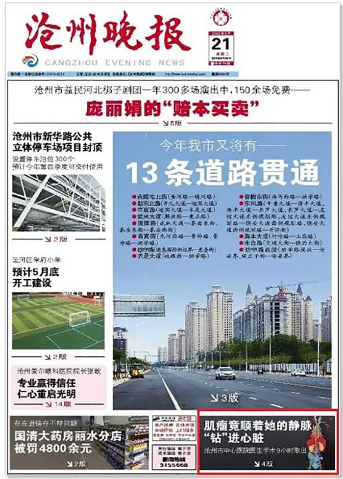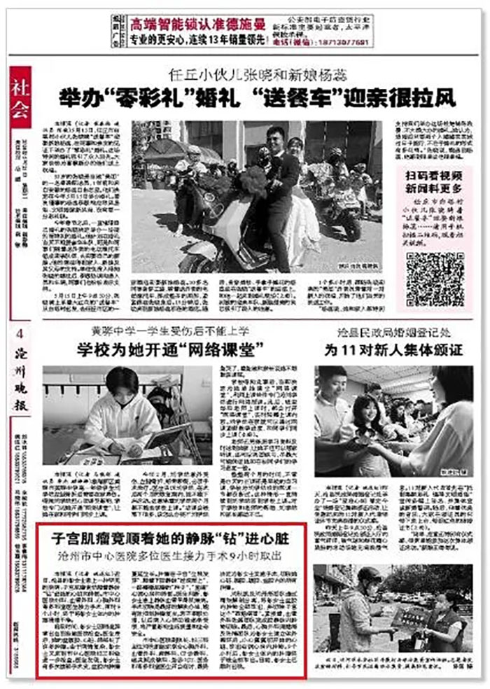 本報(bào)訊 (記者 姚連紅)近日,滄縣的彭女士患上一種罕見的疾?。鹤訉m肌瘤竟然順著靜脈“鉆”進(jìn)她的心臟和肺部。市中心醫(yī)院婦科、血管外科、心胸外科等多科室醫(yī)生接力手術(shù),用時(shí)9個(gè)小時(shí),終于將彭女士體內(nèi)的腫瘤清理干凈。