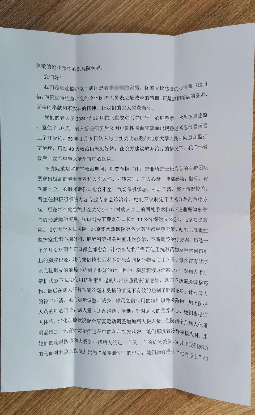 日前,一封飽含深情的感謝信遞交至滄州市中心醫(yī)院,患者李某的家屬以此表達(dá)對(duì)該院急診ICU醫(yī)護(hù)團(tuán)隊(duì)的誠(chéng)摯感激。在醫(yī)護(hù)人員的精心救治下,被多家大醫(yī)院判定“希望渺?!钡睦先似孥E般轉(zhuǎn)危為安,康復(fù)出院。