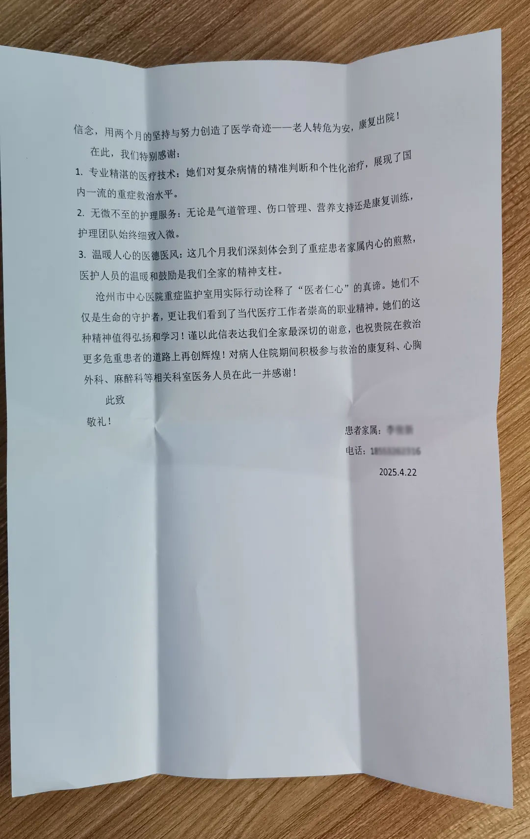 如今,老人已康復(fù)出院,家屬為此寫(xiě)來(lái)感謝信。信中,家屬特別點(diǎn)贊醫(yī)護(hù)團(tuán)隊(duì)三大亮點(diǎn):一是專(zhuān)業(yè)精湛的醫(yī)療技術(shù),精準(zhǔn)判斷復(fù)雜病情并個(gè)性化治療,展現(xiàn)國(guó)內(nèi)一流重癥救治水平;二是無(wú)微不至的護(hù)理服務(wù),從氣道、傷口管理到營(yíng)養(yǎng)支持、康復(fù)訓(xùn)練,細(xì)致入微;三是溫暖人心的醫(yī)德醫(yī)風(fēng),醫(yī)護(hù)人員的鼓勵(lì)成為患者家屬的精神支柱。
